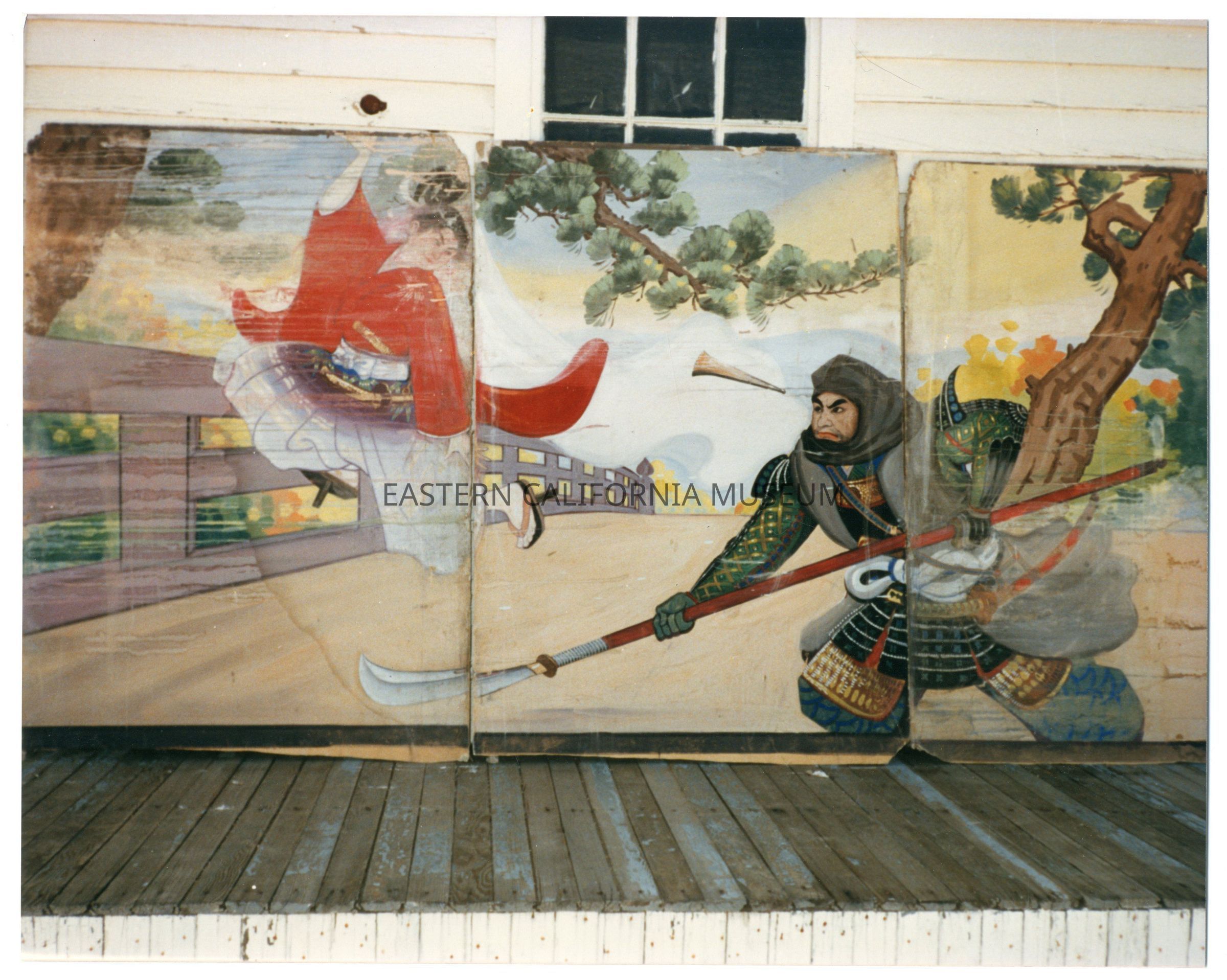 Color photo of the Ushiwakamaru and Benkei triptych mural painted by Masasuke Henry Kumano of Block 19. It was painted on the Block 16 mess hall wall and now is in the collections of the Eastern California Museum (2020.2.6-8).