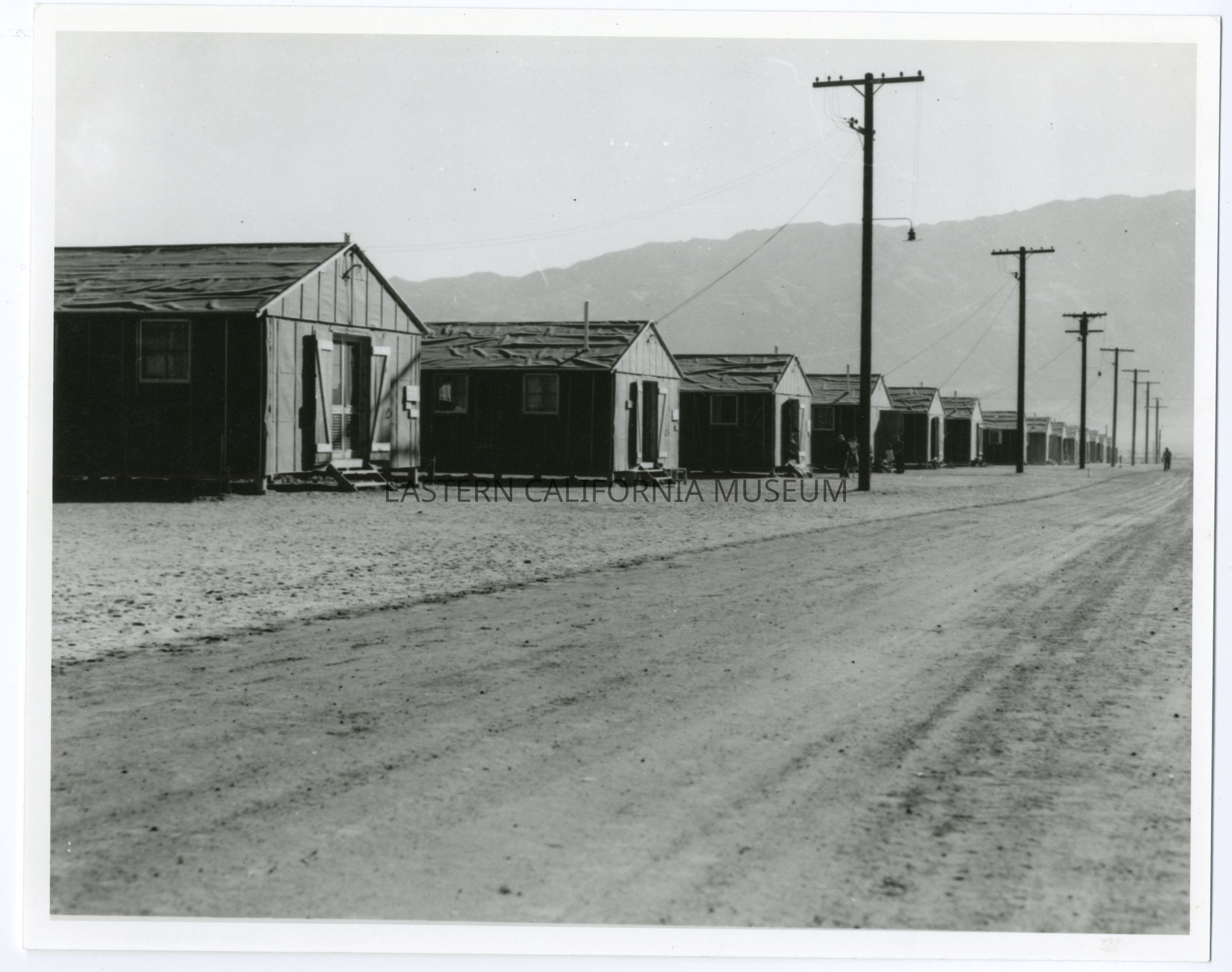 Copy of a b/w photo of a row of barracks, a dirt road, and line of power poles. The roofs appear unfinished.