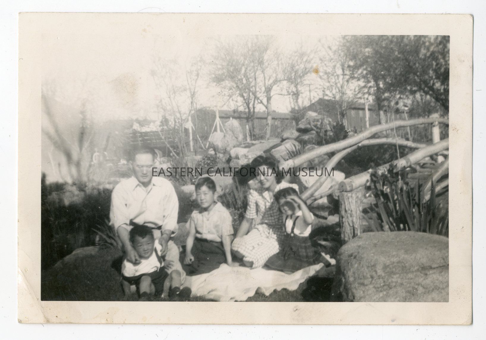 B/w photo of a man and woman with three children sitting near a bridge in one of the parks at Manzanar War Relocation Center.