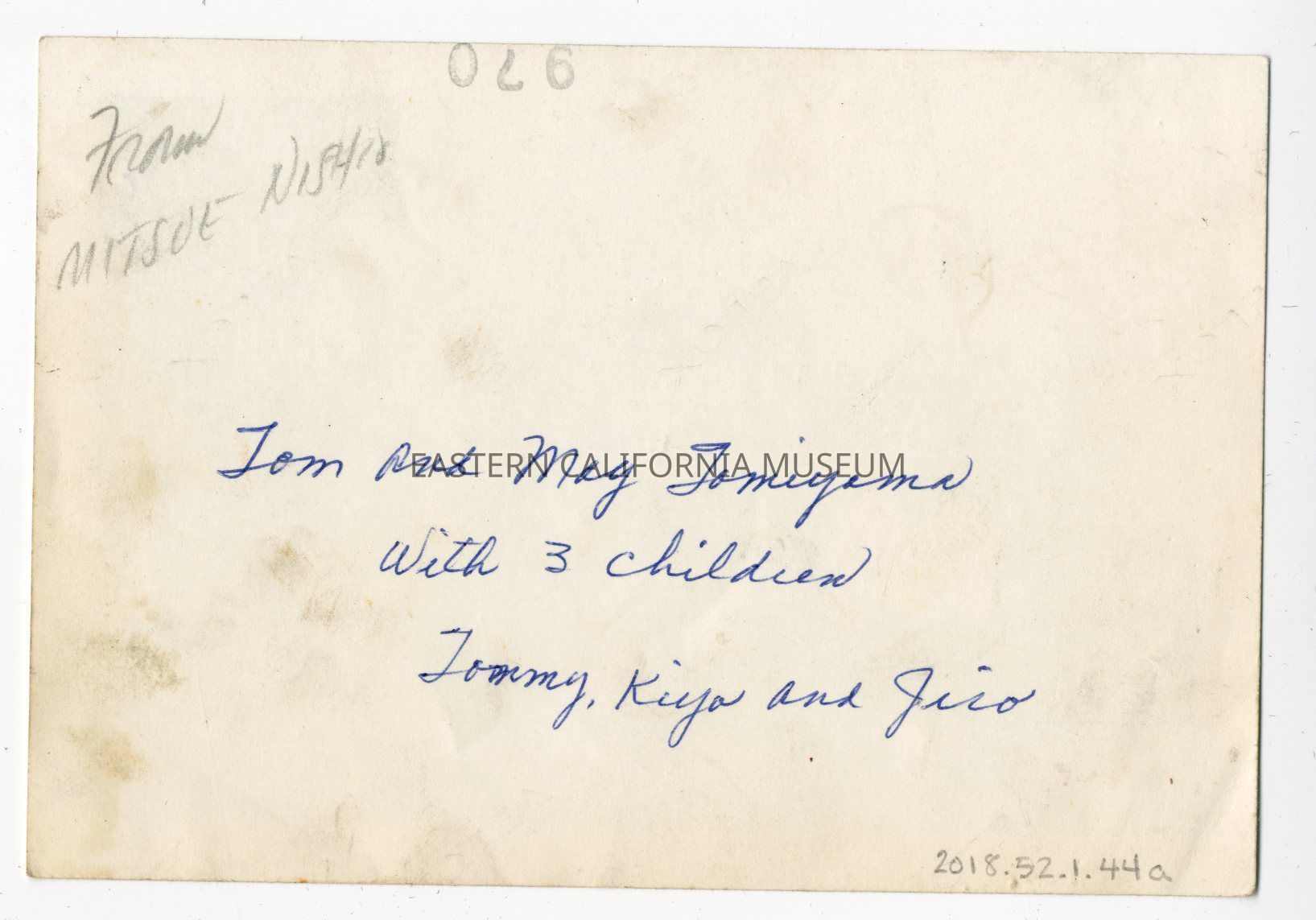 Written in blue ink on reverse: Tom and Mag Tomiyama with 3 children, Tommy, Kiya, and Jiro.