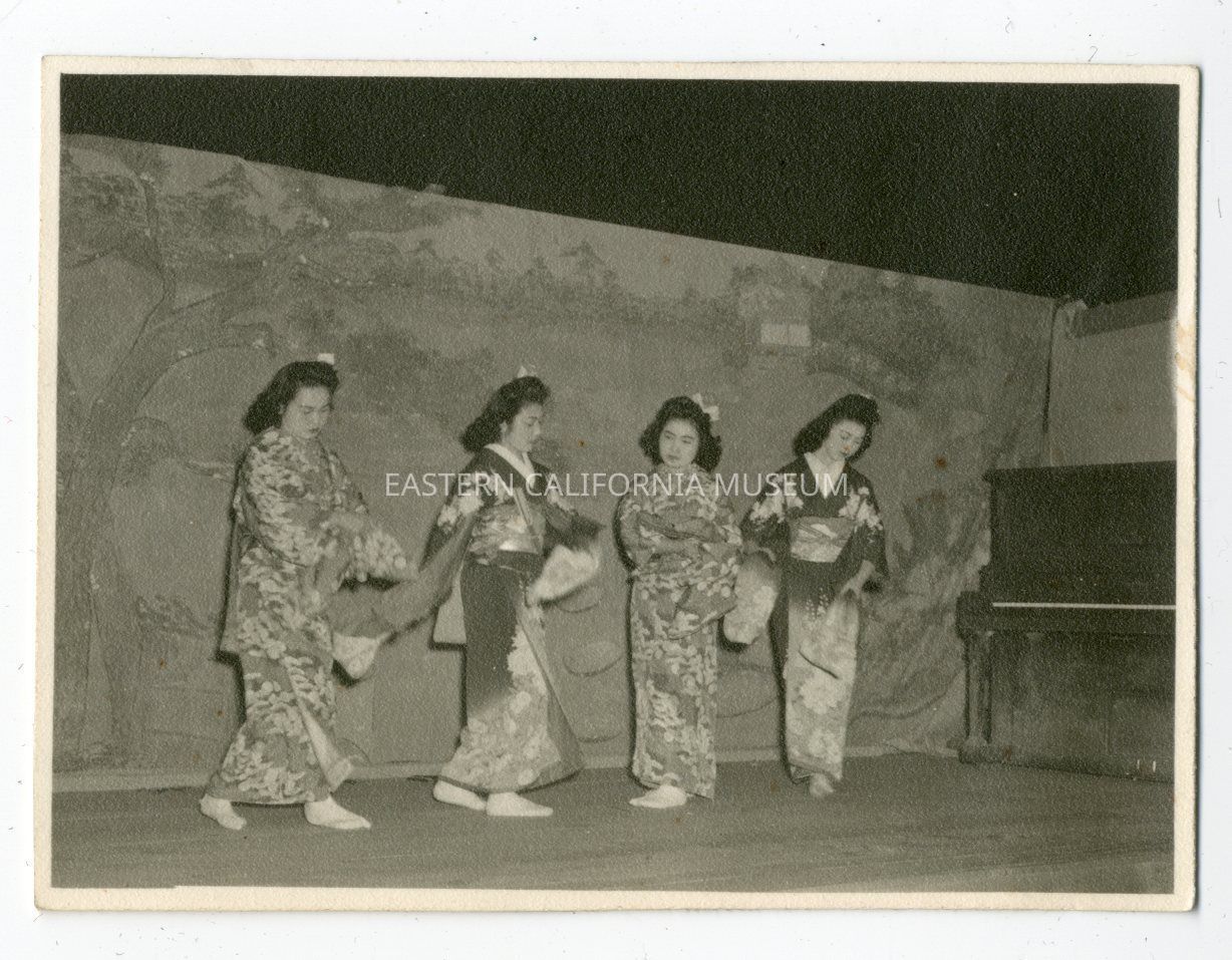 B/w photo of four female performers in kimonos on stage. There is a piano on the right side. Location is likely Manzanar War Relocation Center.