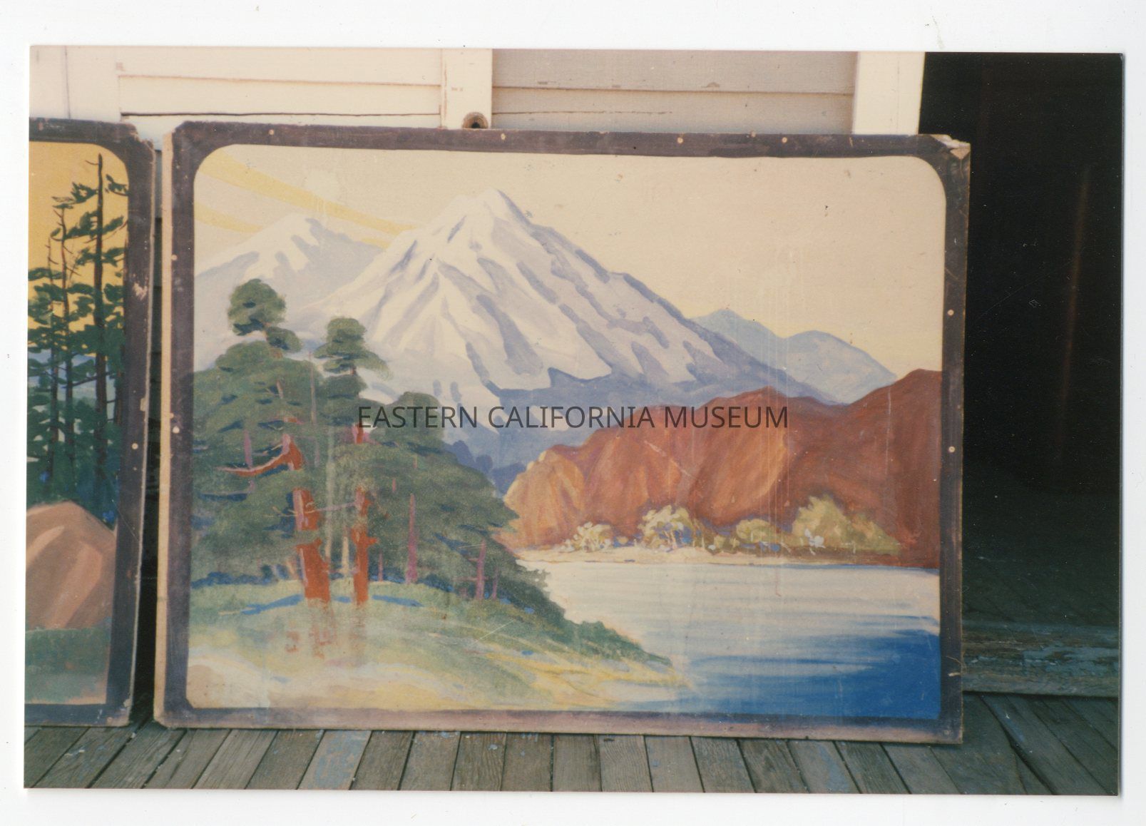 Color photo of a mural of mountain and trees. This mural was painted at Manzanar War Relocation Center, and now is in the collections of the Eastern California Museum (2020.2.5).