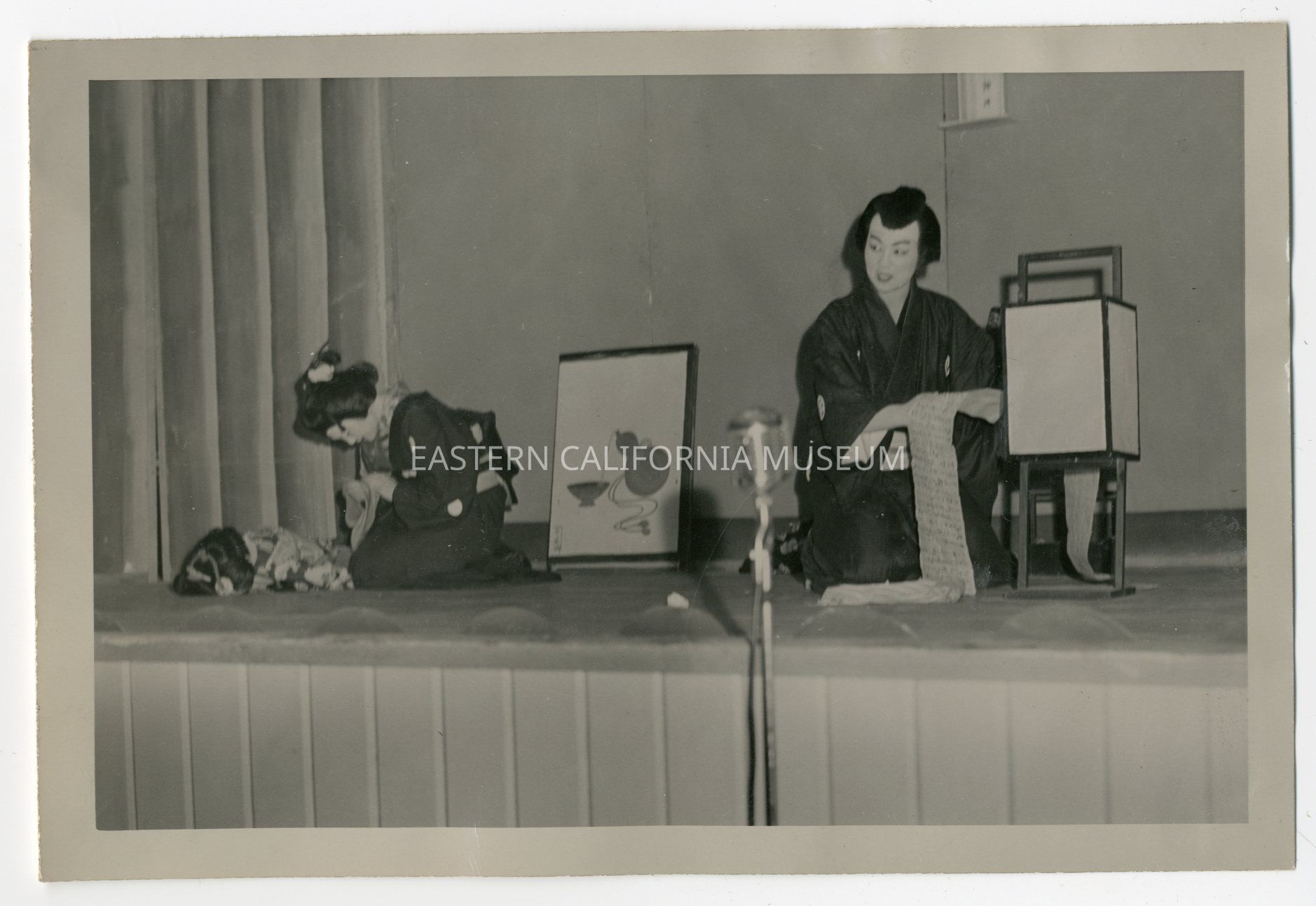 B/w photo of two performers wearing kimonos on the Manzanar Auditorium stage. There is a painting of a gourd and bowl, what appears to be a paper lantern, and a long scroll.