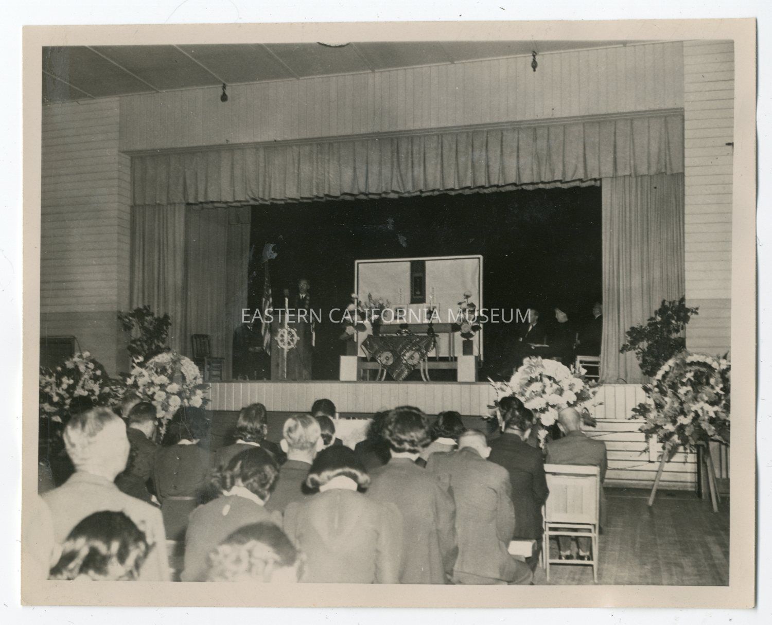 B/w interior photo of the Manzanar Auditorium and stage. There are man people in the audience and a few more on the stage. There are several large floral arrangements in front of the stage, and it looks like two photos of young men in uniform on an altar in the center of the stage. This may be part of the memorial service for Sgt. Kiyoshi Robert Nakasaki and Pfc. Sadao "Spud" Munemori, who were killed in action in Italy, April 5, 1945.Photograph Details
