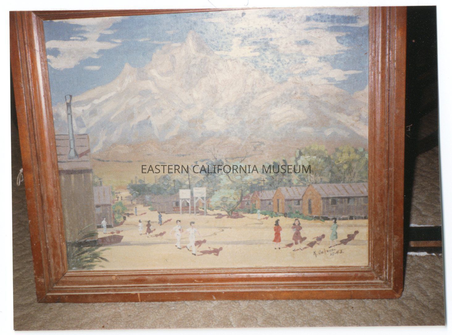 Color photo of a framed painting of what looks like Manzanar. There are rows of barracks with the basketball hoops in the center, lots of people in the center, and a large mountain in the background that might be Mt. Williamson. It is signed and dated in the lower right corner: K. Uetsuei, 1943.