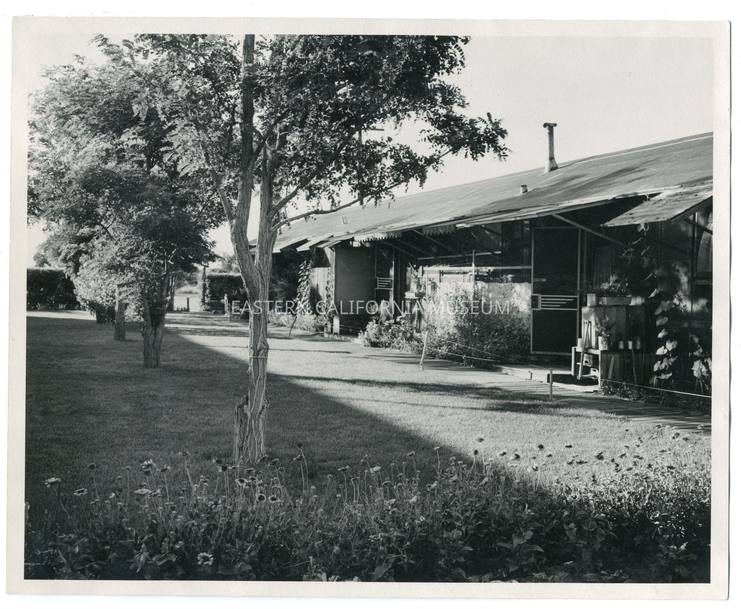 B/w photo of what might be the Caucasian Quarters at Manzanar War Relocation Center. It is a long barrack-like building but not so high off the ground and it leads out to a large grassy lawn with several trees and gardens or flower beds.Photograph Details