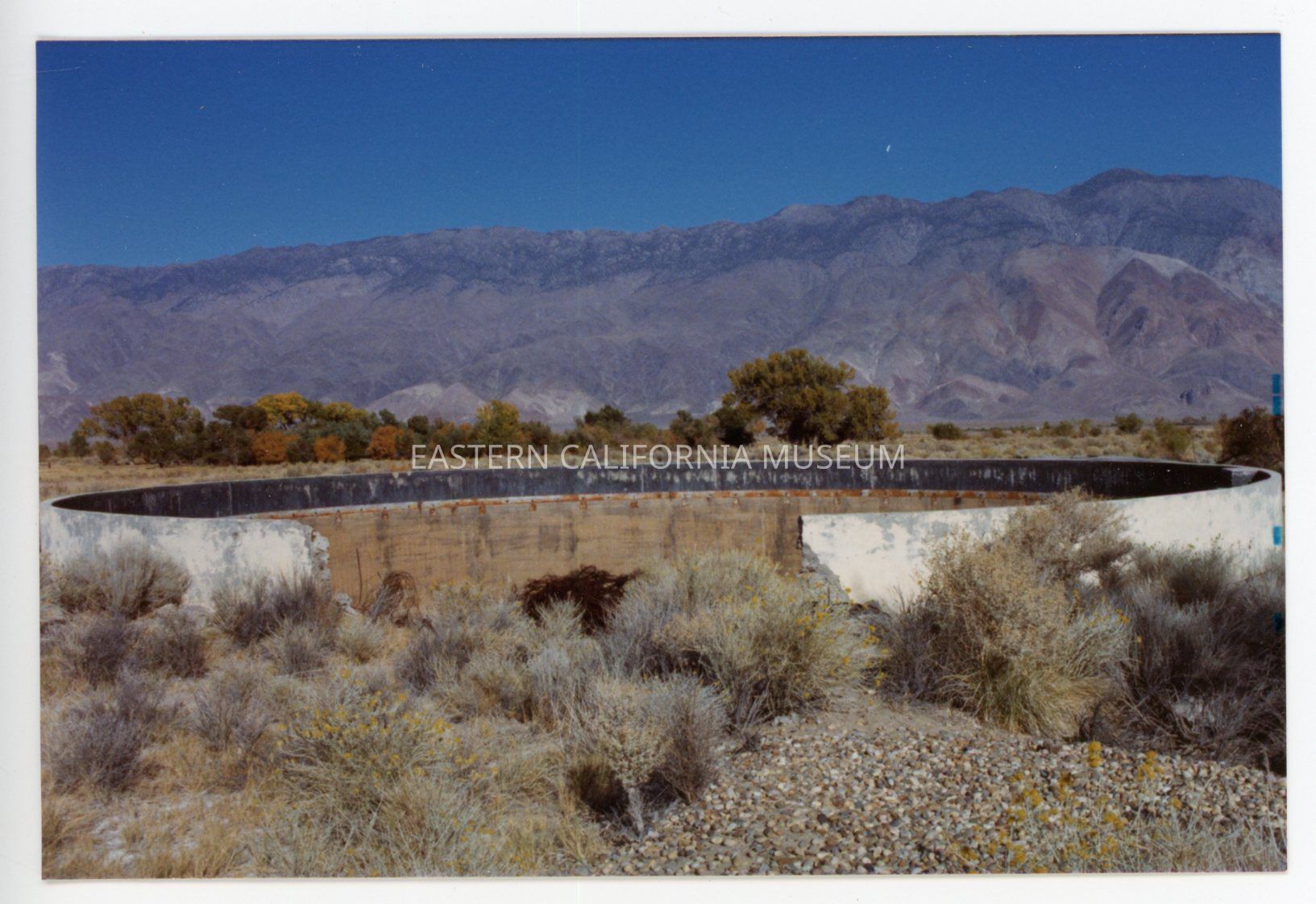 Color photo of a large concrete basin in the ground. There is a concrete ring or rim above the ground as well. A label with it says, "Clarifier."