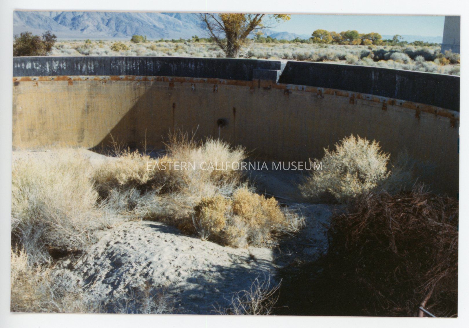 Color photo of a large concrete basin in the ground. There is a concrete ring or rim above the ground as well. A label with it says, "Clarifier."