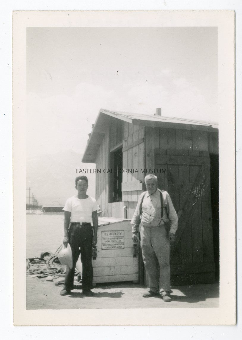 B/w photo of two men, one Japanese and one Caucasian, standing by a wooden building and sign that says, "U.S. Property."