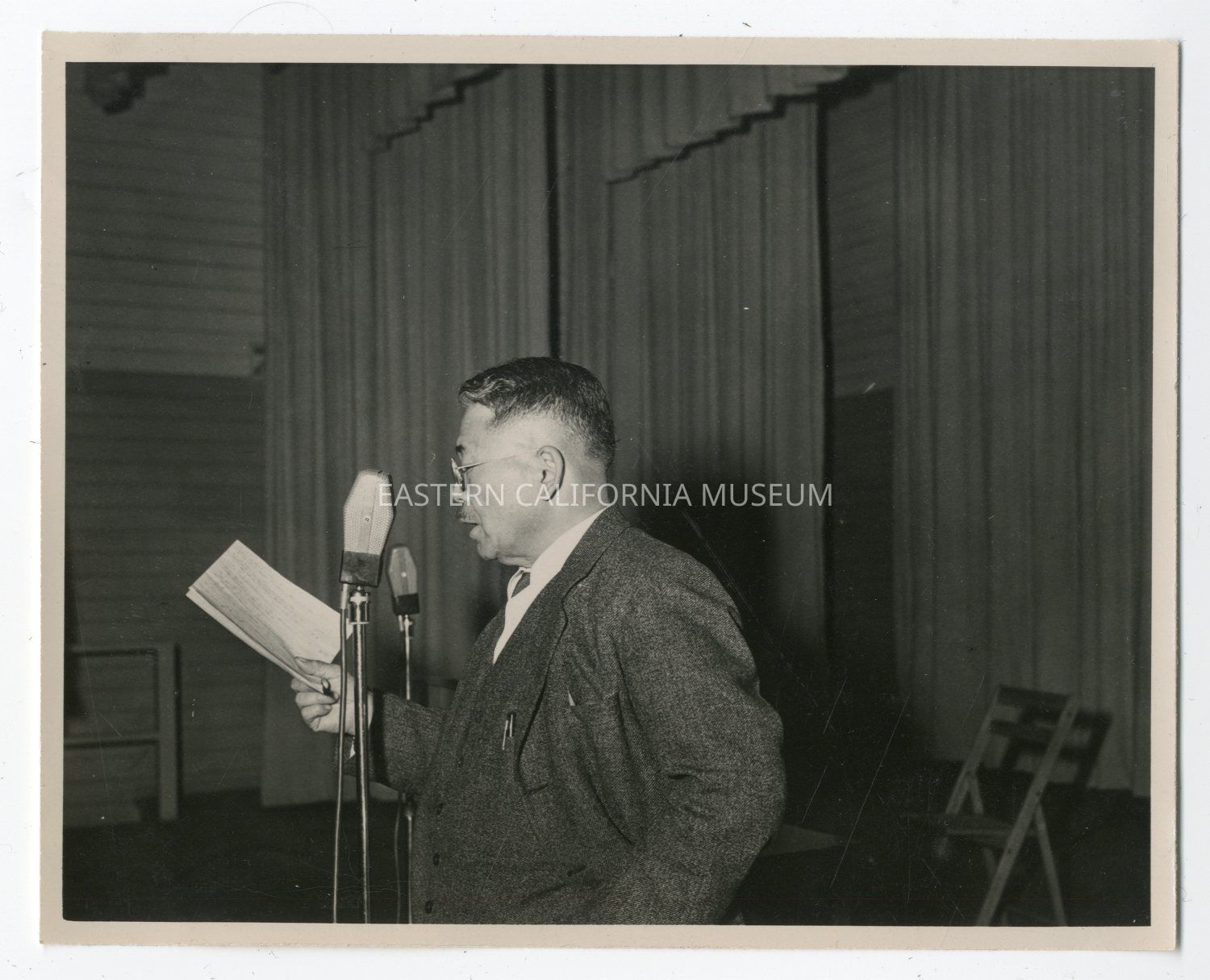 Photo of a Japanese man reading a speech into a standing microphone on the Manzanar Auditorium stage.