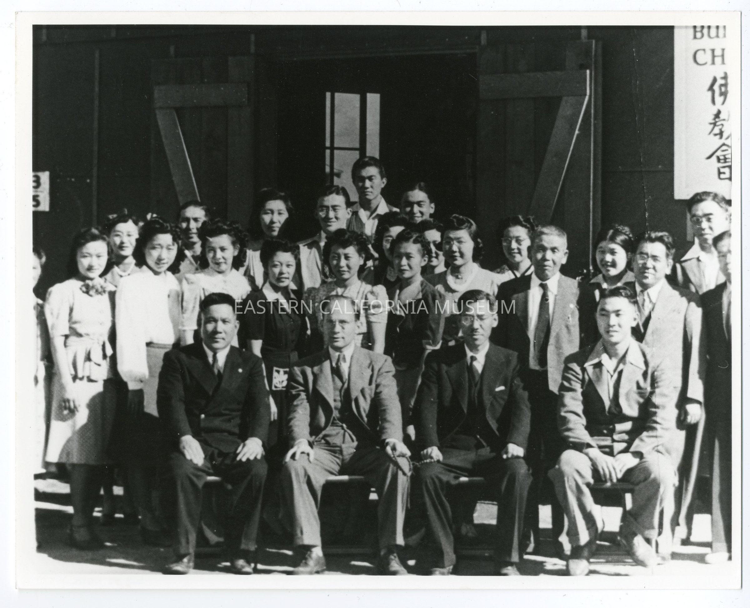 Copy of a b/w photo of a group of people in front of the Buddhist Church at Manzanar War Relocation Center.