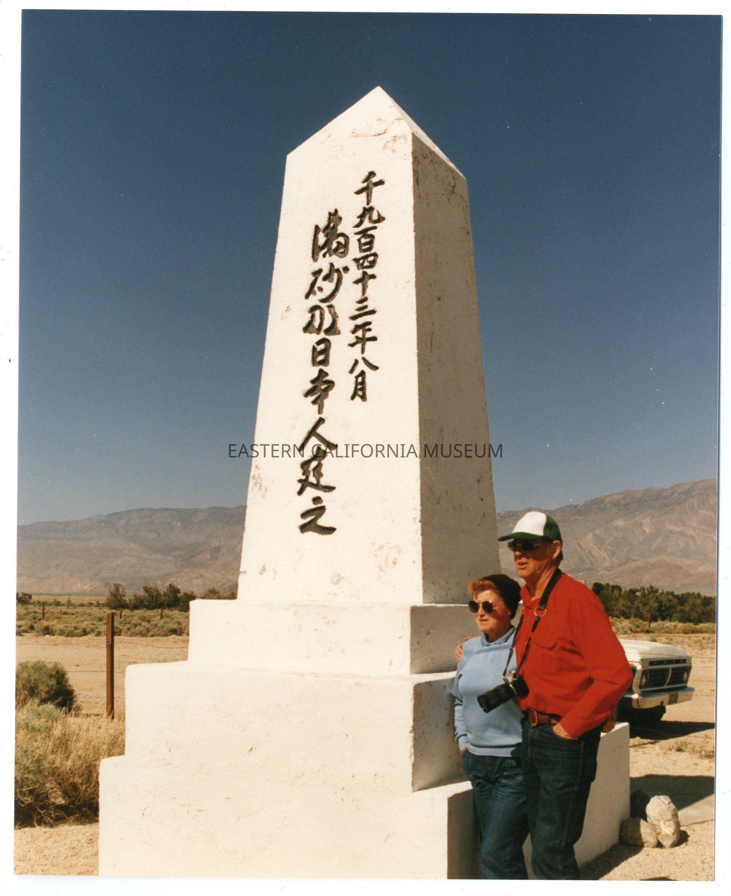 Color photo of a man and woman standing by the cemetery monument at Manzanar.