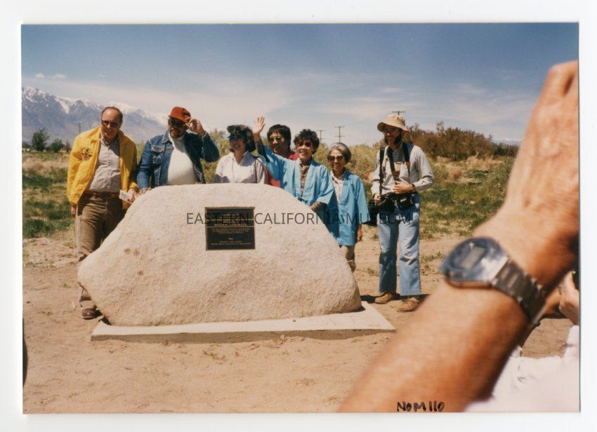 Color photograph from unveiling of National Historic Landmark plaque at Manzanar on April 26, 1986. From let to right: Ed Rothfuss, Supt. Of Death Valley National Monument, Congressman Mervyn Dymally, unknown, unknown, Sue Embrey, Grace Harada, unknown photographer.Photograph Details
