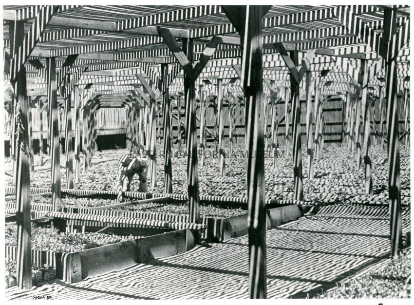 Black and white photograph of a man tending to the plants in the guayule rubber project lathe house at Manzanar.Photograph Details