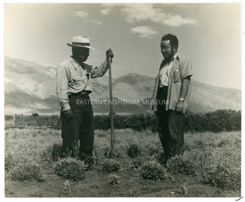 Black and white photograph of S. Shima and Shimpe Nishimura in a guayule field that was part of the guayule rubber project at Manzanar.Photograph Details