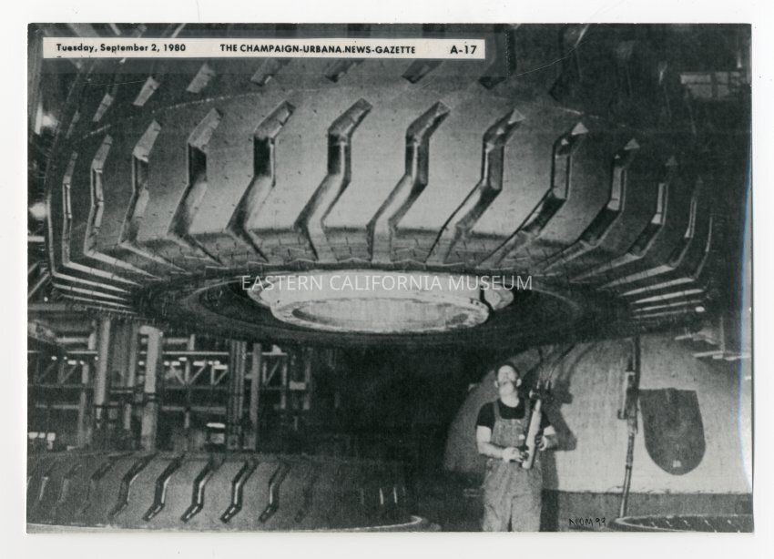 Photograph of a ten foot diameter tire made from guayule rubber. Caption included in photograph is: Tuesday, September 2, 1980, The Champaign-Urbana News-Gazette, A-17.