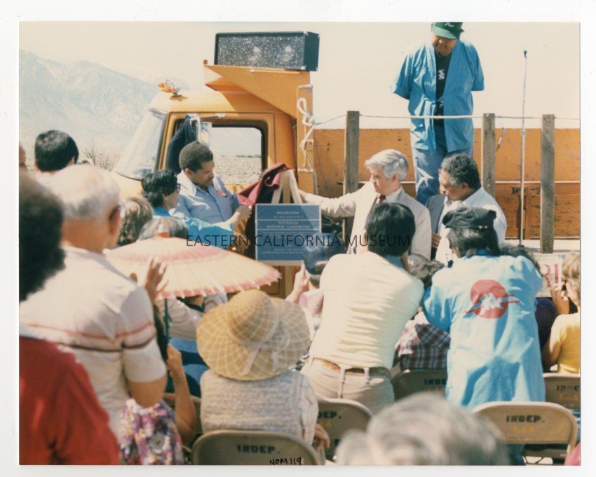 Color photograph of the the presentation of the National Historic Plaque at the 1985 Manzanar Pilgrimage on April 27, 1985. Photo is taken at the pilgrimage site at the Manzanar Cemetery in front of the yellow LADWP flatbed truck that was used as a stage for the pilgrimage event.Photograph Details