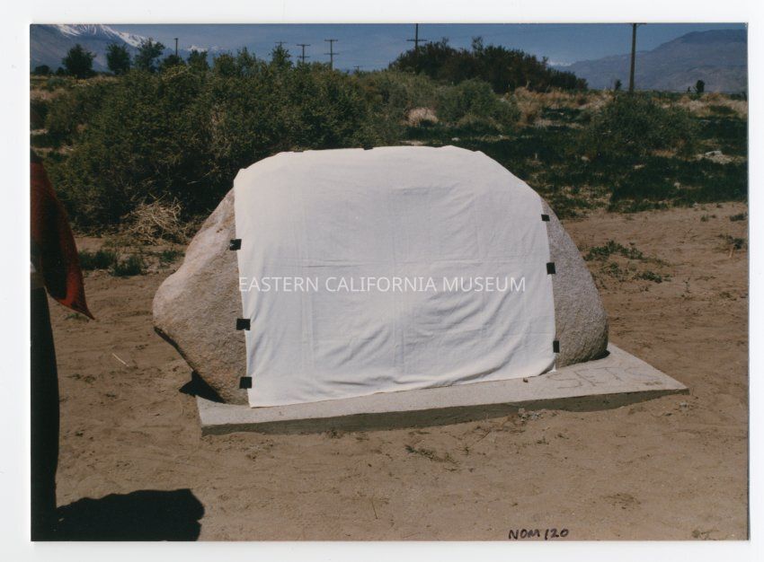 Color photograph from unveiling of National Historic Landmark plaque during Manzanar Pilgrimage on April 26, 1986. Plaque is covered with cloth drape before unveiling.