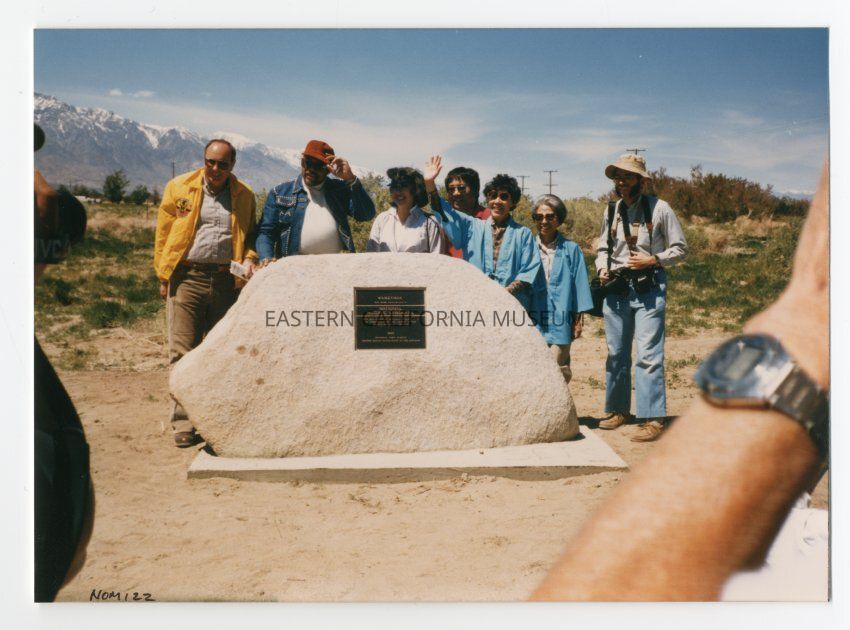 Color photograph from unveiling of National Historic Landmark plaque at Manzanar on April 26, 1986. From left to right: Ed Rothfuss, Supt. Of Death Valley National Monument, Congressman Mervyn Dymally, unknown, unknown, Sue Embrey, Grace Harada, unknown photographer.Photograph Details