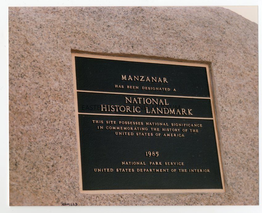 Color photograph from 1986 Manzanar Pilgrimage showing National Historic Landmark plaque after being installed on granite boulder at entrance to Manzanar site.