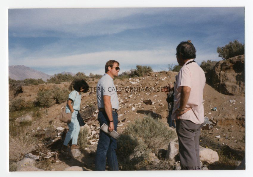 Color photograph of author Kirk Mitchell, Shi Nomura, and an unidentified woman standing at the site of one of the historic dumps from Manzanar.