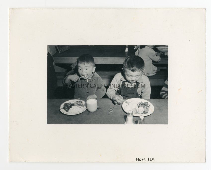 Photograph of two children sitting at a mess hall table eating off of the plates of food in front of them.