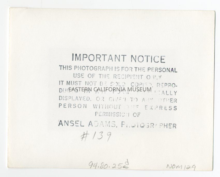 Stamped on reverse with Ansel Adams's information and his ID #139.Photograph Details