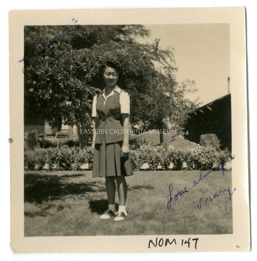 Exterior photograph of Mary Kageyama Nomura standing on grass in front of row of shrubs and a tree in Block 12 garden. Written in blue ink on lower right corner of photo is "Love Always, Mary" and written in upper left corner of photo in blue ink is "To Dearest [illegible]."