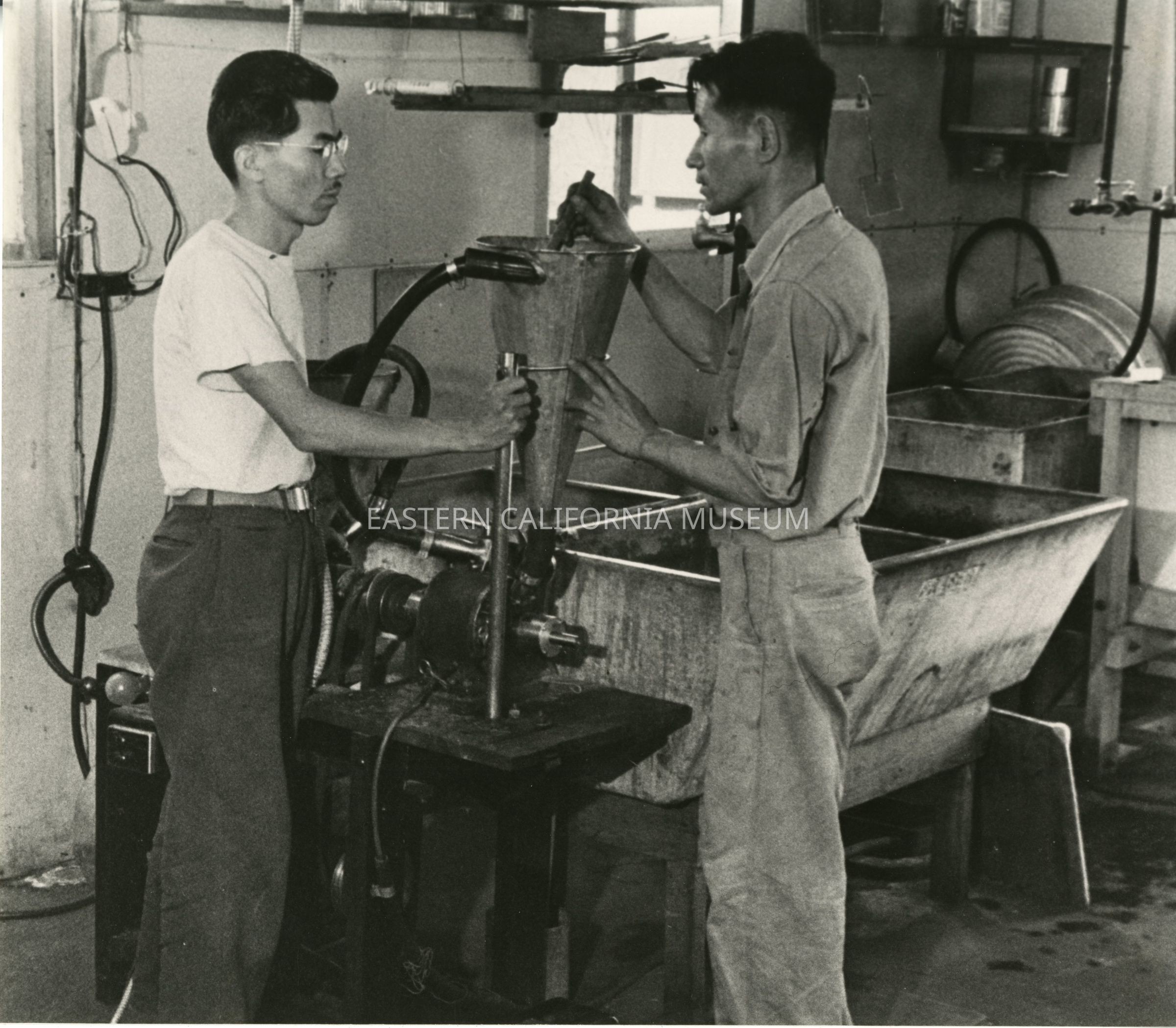Photo of Frank Hirosawa and Joe Nishimura with guayule mill.Photograph Details
