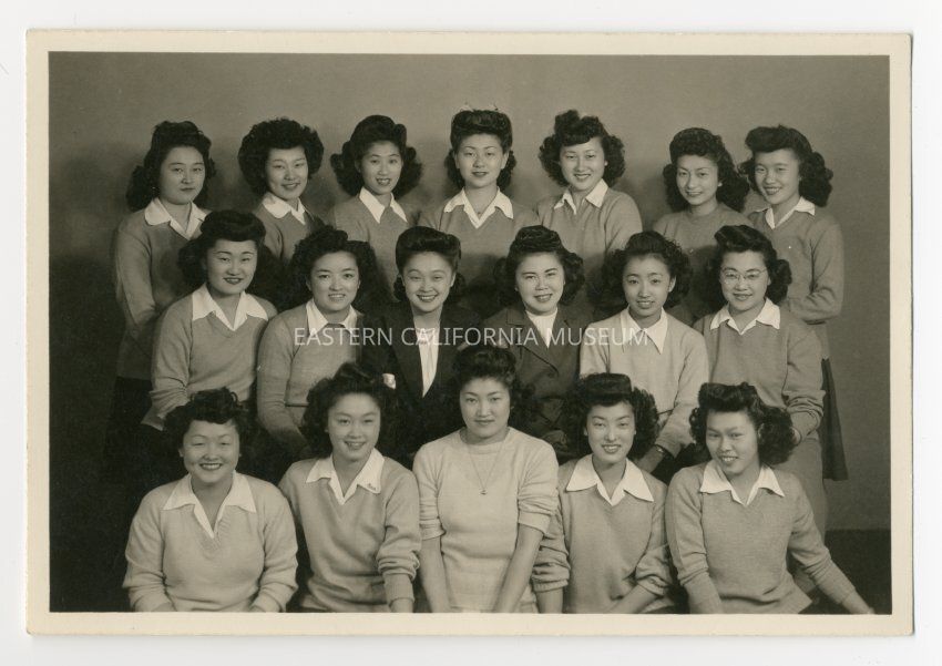 Interior photograph of 18 young women in 3 rows, all dressed in similar style. This is "The Modernaires" club in 1944. From Densho: Back row: Junko Hatae, Alice Araki, Shizuko Uno, Mary Kageyama, Chicki Hiraoka, Fumi Matsuzawa, Teruko Kuwata. Row Two: Reiko Ando, Yuki Inohara [or Yuki Yoshimura?], Grace Maruki, Akiko Sakamoto (Advisors), Kazie Nishimoto, Michiko Kamachi. Row One: Yoshiko Kusunoki, Rosie Maruki, Kiyo Tanioka, Toshiko Morishita, Itoyo Hashimoto.