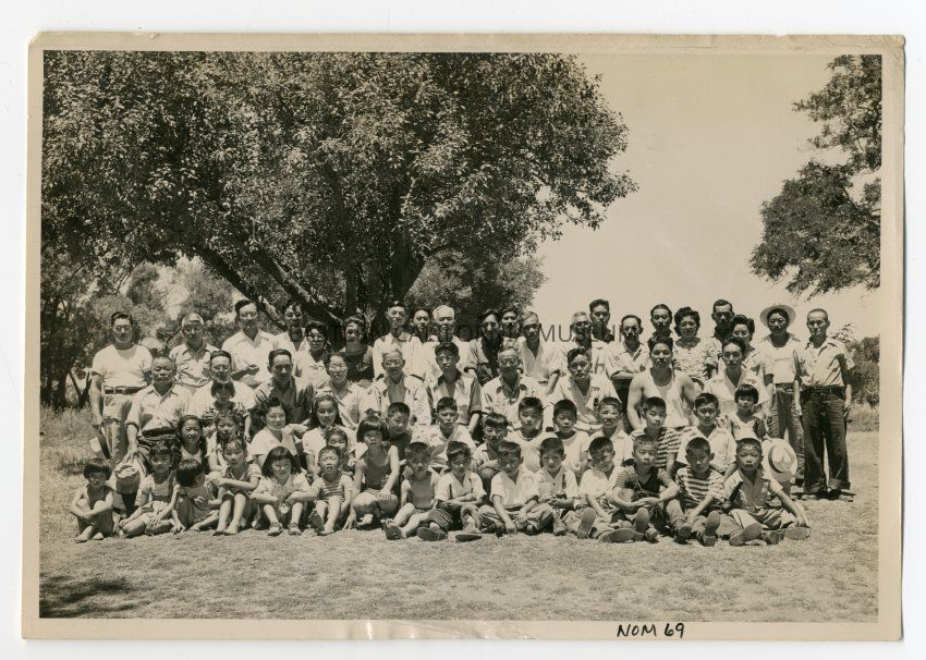 Exterior photograph of more than 60 people including adults and children with trees in background. Block 21 picnic at Bairs Creek 1944.Collection
