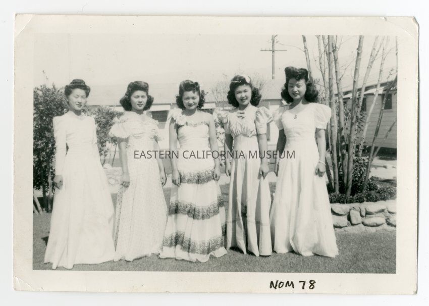Exterior photograph of 5 young women wearing floor-length formal dresses.