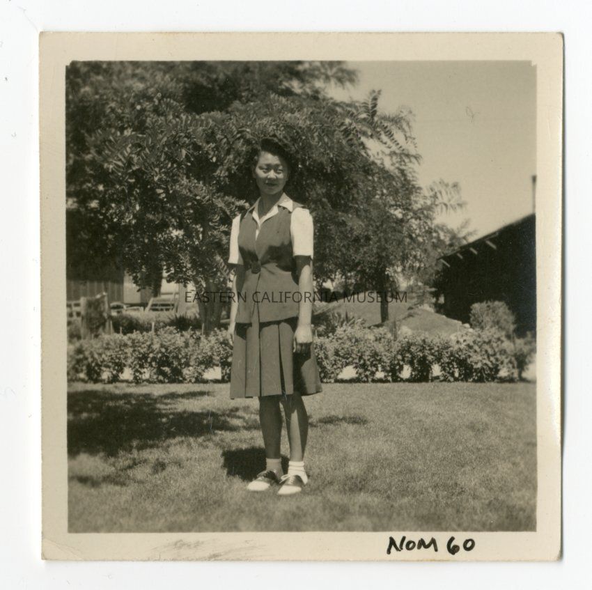 Unidentified woman sitting on grassy hill with tree and edge of building in background. Likely one of the Manzanar War Relocation Center gardens.Photograph Details