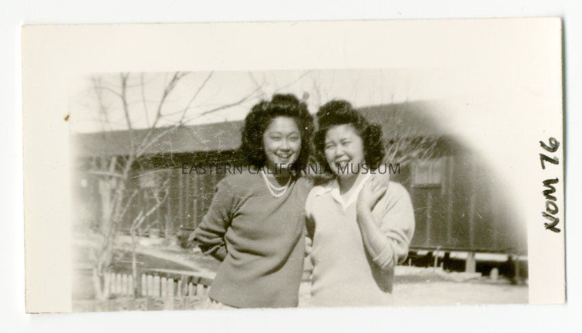 Exterior photograph of two young women standing in front of a barracks building. Bottom portion of photograph has been trimmed off.Photograph Details
