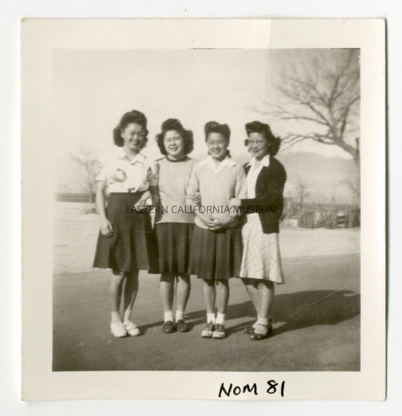 Exterior photograph of 4 unidentified young women standing side-by-side facing the camera.Photograph Details