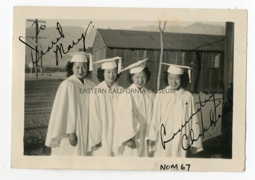 Exterior photograph of 4 women in white graduation caps and gowns with barracks buildings in background. Written in ink on photograph is: "To Dearest Mary:' in upper left corner and "lovingly Chicha (or Chicka)" in lower right corner.Photograph Details