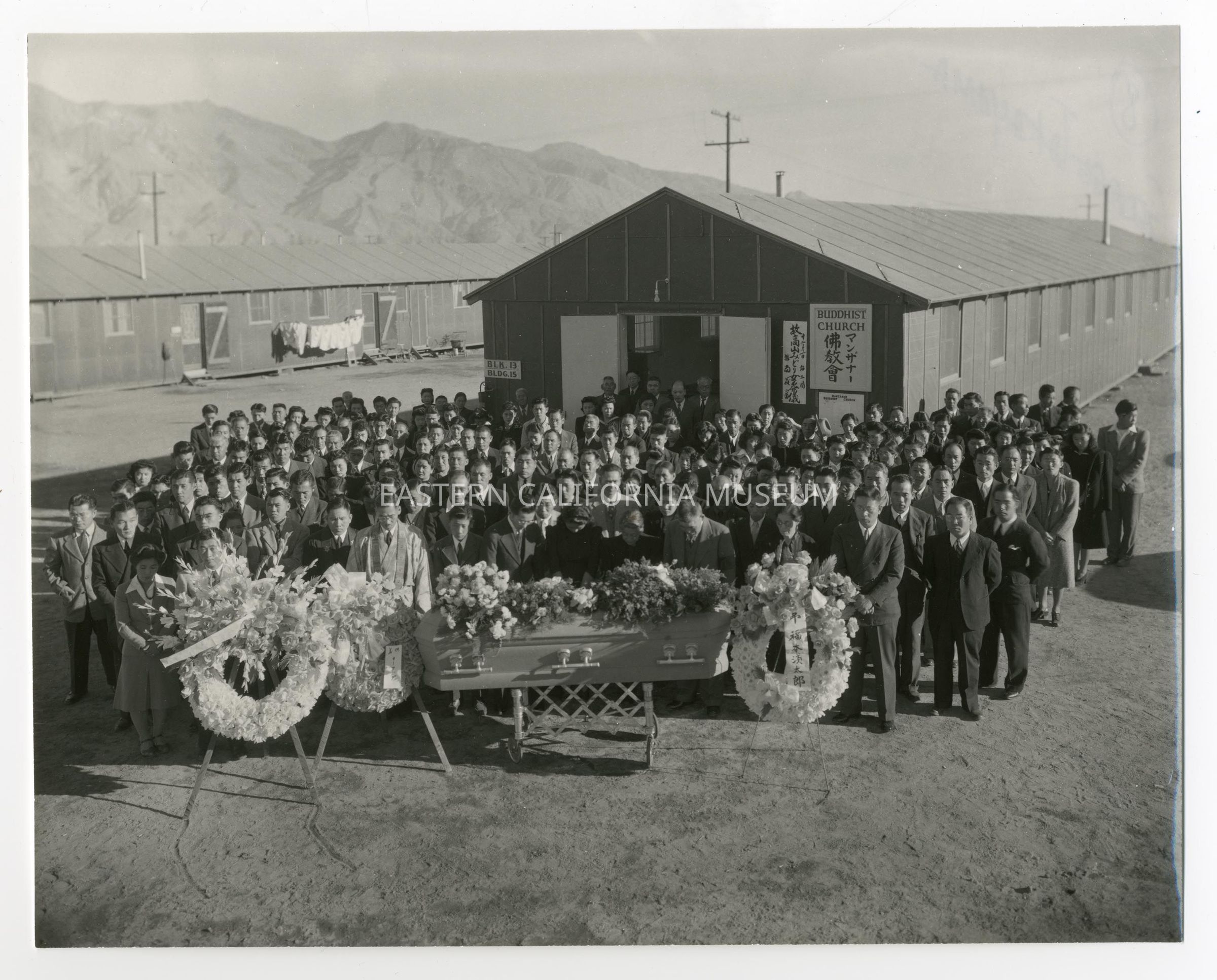Exterior funeral scene in front of the Buddhist Church at Manzanar War Relocation Center.