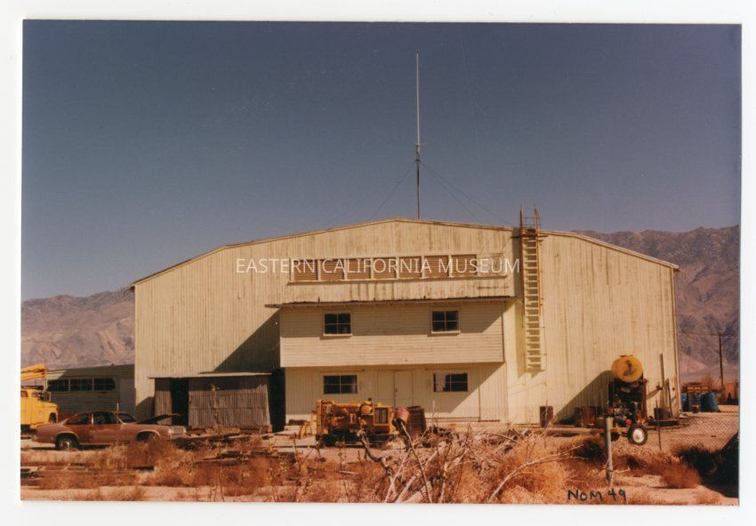 Color photograph of Manzanar Auditorium from the west side facing east. Photo shows variety of equipment and junk outside the building while it was being used by the Inyo County Road Department.