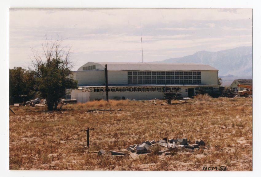Color photograph of Manzanar Auditorium taken from the north looking south. To the west of the auditorium is the east edge of another building which is not original to that location, possibly something moved in by Inyo Road Department. At bottom of photo is a pile of rubble and a water faucet.