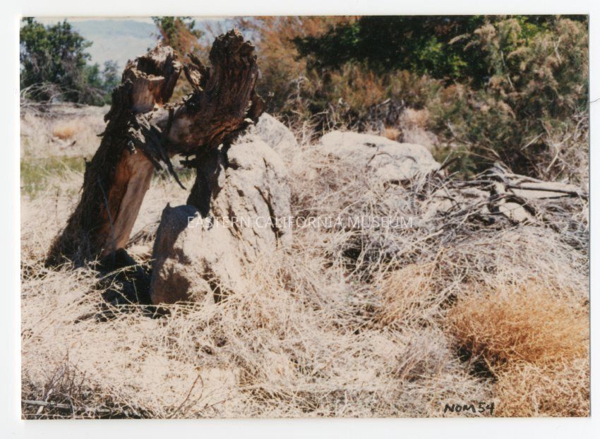 Color photograph of rocks, brush and stumps, with a granite boulder on edge, possibly part of a pond or other landscape feature. Possibly the remains of Pleasure Park in 1985?