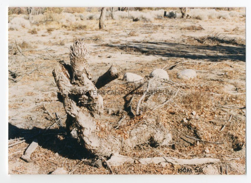 Color photograph of twisted stump in front of alignment of 4 rocks. Next to this photo on panel 1994.80.10 is a cut-out from Manzanar map that indicates this is from Block 24, between Buildings 5 and 6.