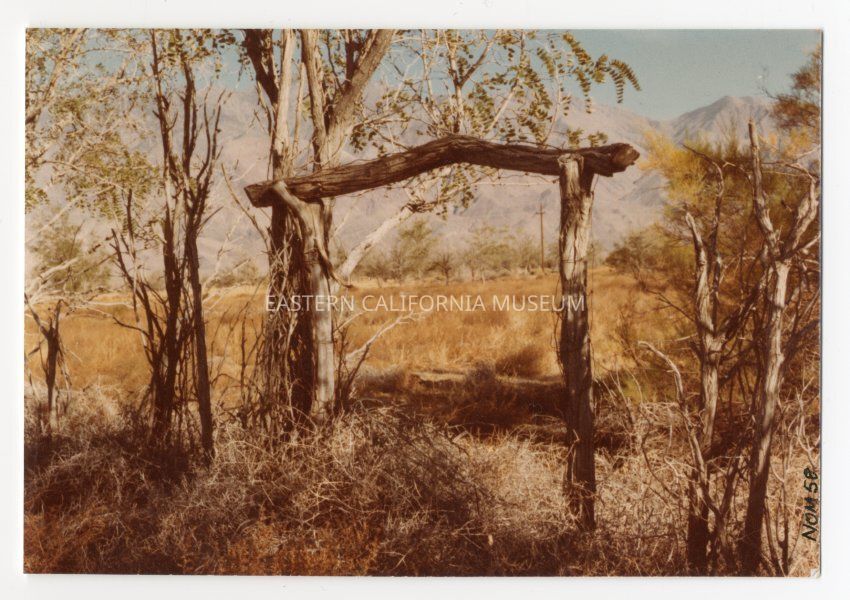 Color photograph of a wooden framework that was the gate entrance featured in photo 1994.82.2.4 (also on panel 1994.80.10) as an entrance through a wall of shrubs. This photograph isn't dated, but is with a group of photos dated Sep. or Oct. 1985.