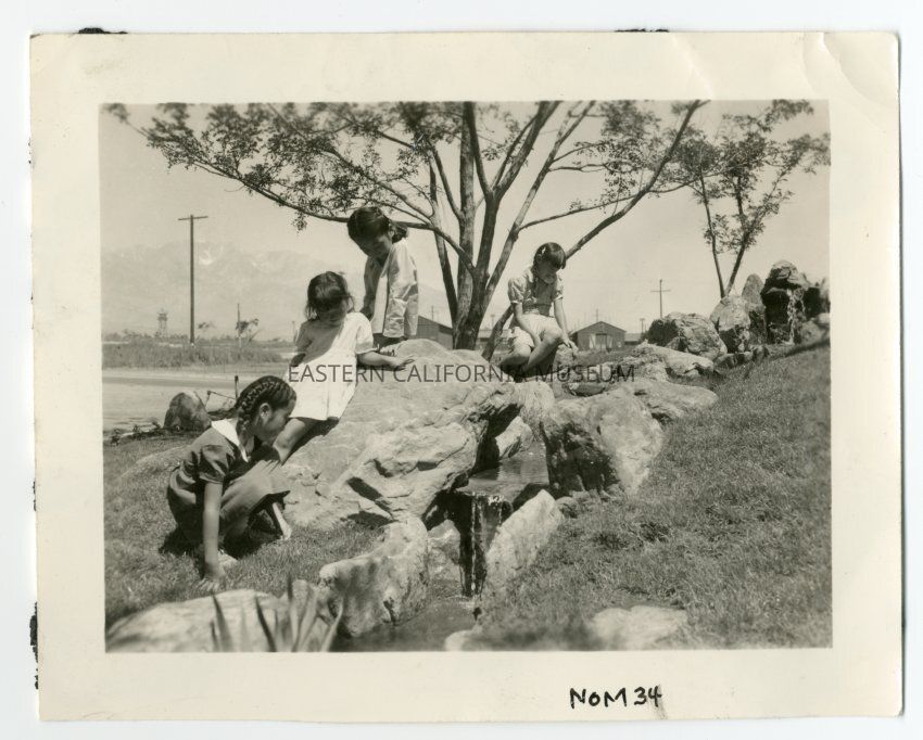 If this photo came from L. Josephine Hawes' photo album (1994.27.1), the caption for this photo would have been, "Children from the Children's Village posed beside the water fall in Block 12."Photograph Details