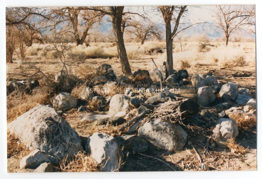 Color photograph of remains of Block 10 garden with rocks and trees.