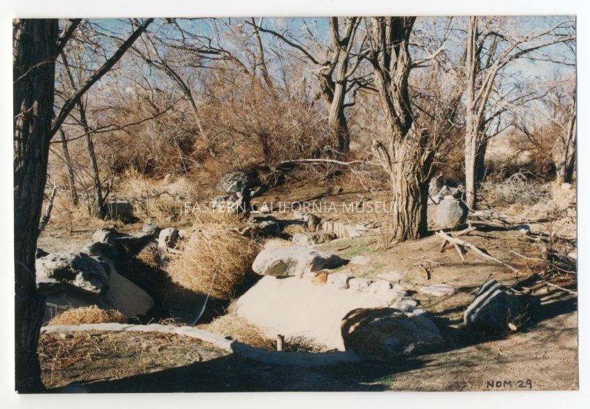 Color photograph of remains of Block 12 garden with rocks, concrete, trees, and brush.