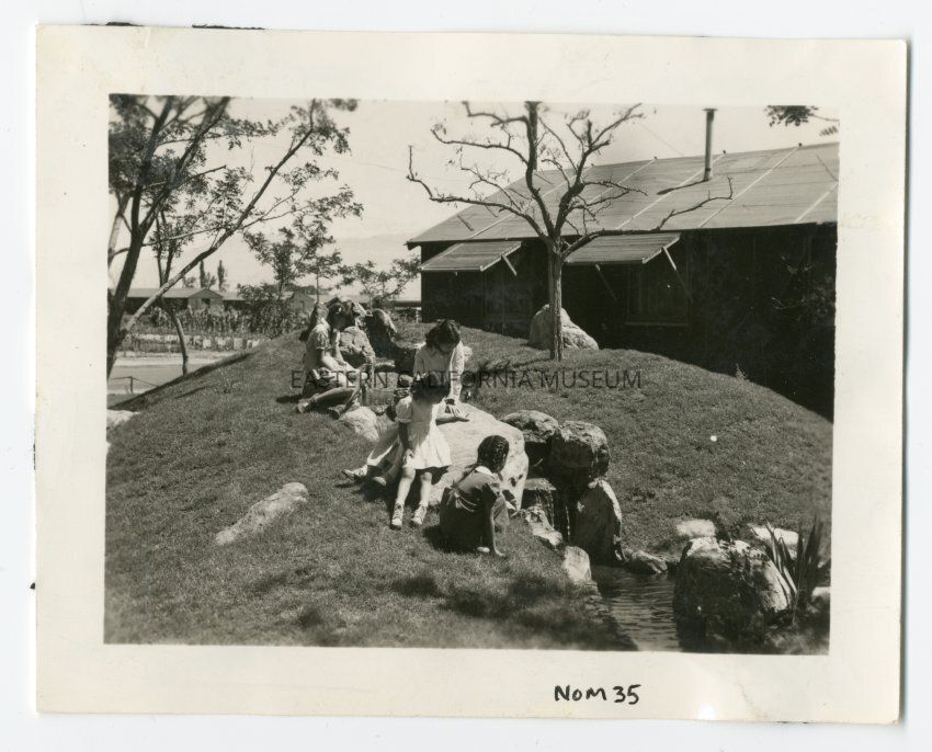If this photo came from L. Josephine Hawes' photo album (1994.27.1), the caption for this photo would have been, "Children from the Children's Village posed beside the water fall in Block 12."Photograph Details