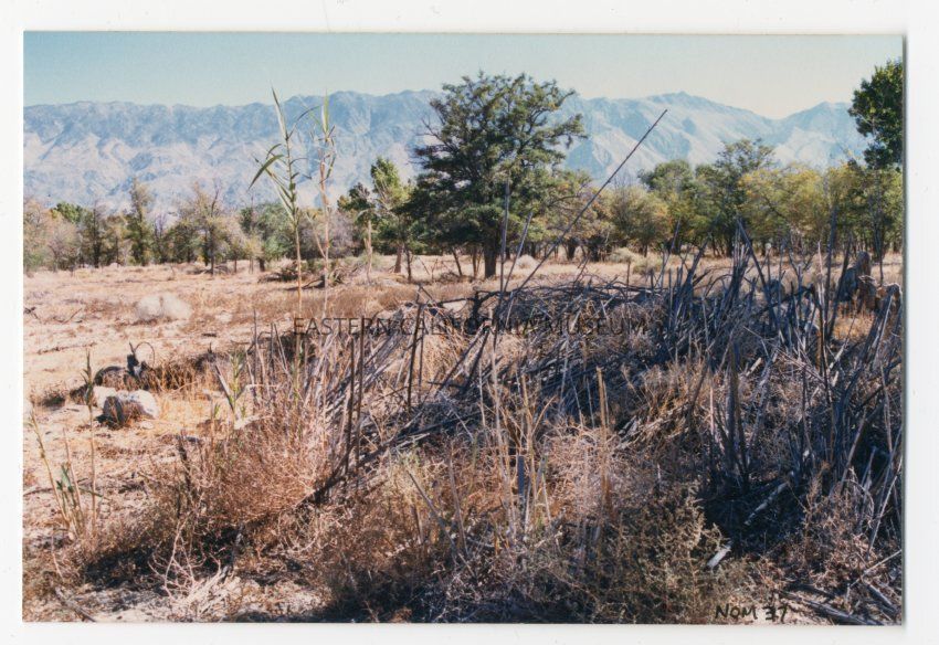 Color photograph of remains of Block 6 garden showing trees, brush, and green bamboo plants with Inyo Mountains in background.
