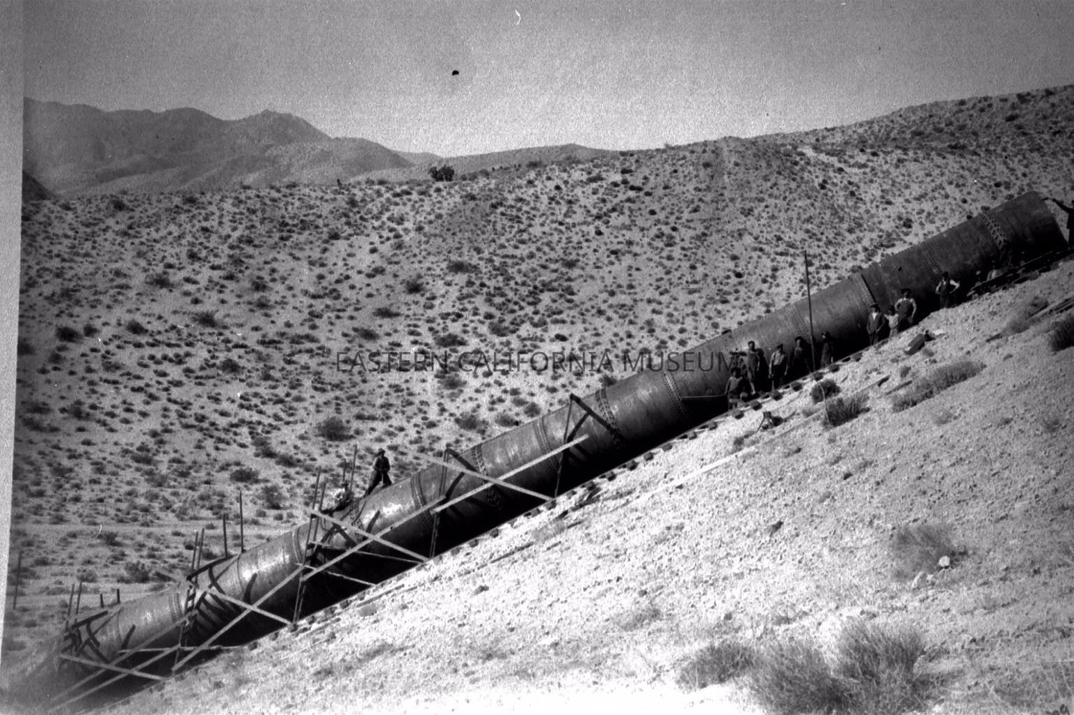 B & W digital scan of LADWP Laborers standing next LA Aqueduct Inverted Siphon under construction, location unknown (possibly Jawbone Canyon.) Note scaffolding and tracks next to Siphon used to haul steel pipe sections into position for riveting.Collection