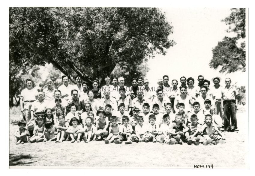 Exterior photograph of 60 people--men, women, and children--in 4 rows on a grassy area in front of trees. Yellow post-it label on bottom of photo identified this group as "Shoe Repair Shop Picnic."Photograph Details