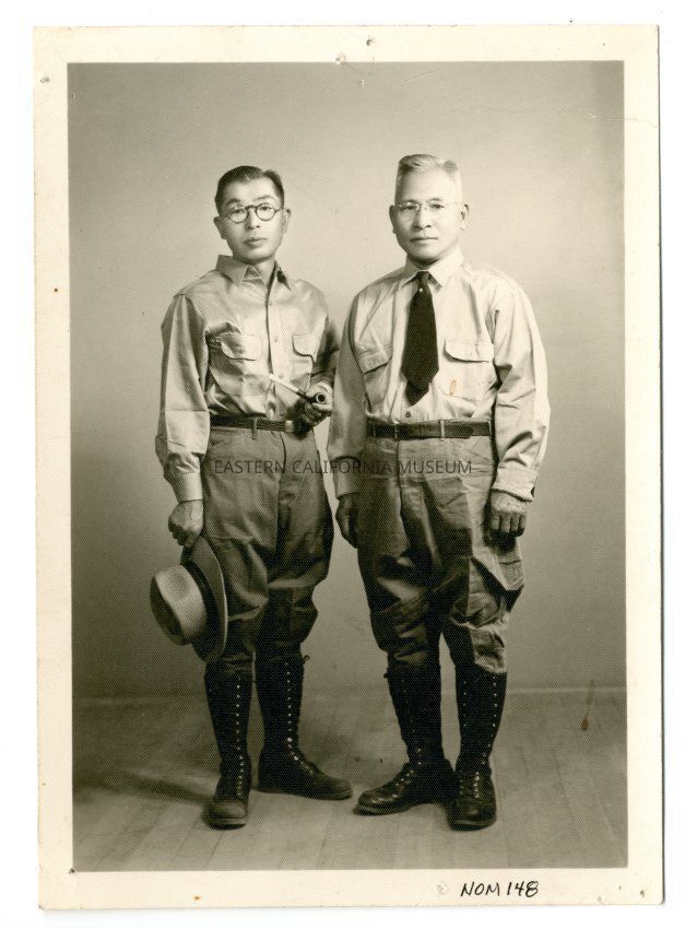 Interior photograph of two men in uniforms without insignia. Both are wearing knee high lace up boots with cavalry style pants. One is holding a hat in right hand. Possibly part of the Manzanar Mounted Patrol that patrolled the picnic area south of Manzanar during daylight hours.Collection